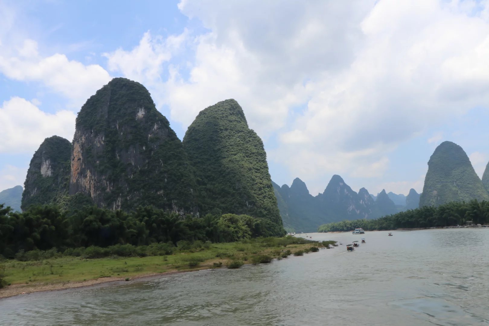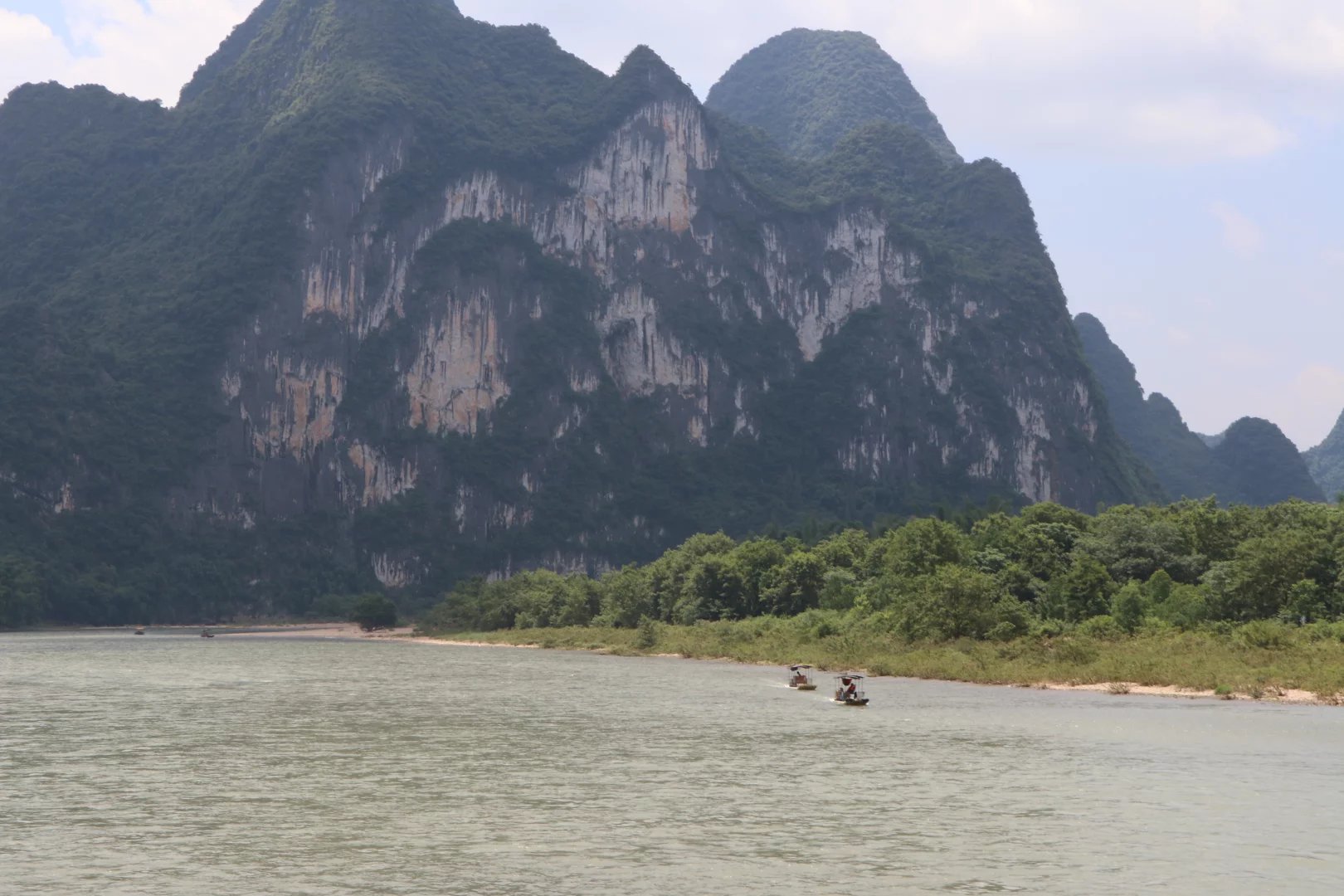 前面都是桂林市中心的景色,接下来我们就从桂林乘船漂流到阳朔,其中主要有两个景点,九马画山和20元人民币背景图,虽然说主要,因为这两个比较出名一点,但是途中很多地方的景色都很不错。听船上的导游说,九马画山是当时孙悟空任弼马温时一时看管不严(他看过?),让九匹马私自跑下凡间,结果被一个画师看见,这个画师就想将他们画下来,然而马儿们却不太乐意,撒起蹄子就跑,结果不小心撞到山里,被永世封印了起来。当然这个传说十有八九是某位能说会道的导游瞎编乱造出来吸引游客的,当然我必须得说他成功了。除了这个古老的传说以外,后世还有个预言,能看出7匹马的就是榜眼了,8匹马的就能任宰相之职,至于能看出9匹马的那就是帝王之命了。