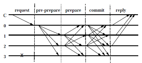 一般情况也就是当primary正常工作的情况下,协议主要分为三个阶段分别是pre-prepare,prepare和commit阶段,如下图所示。